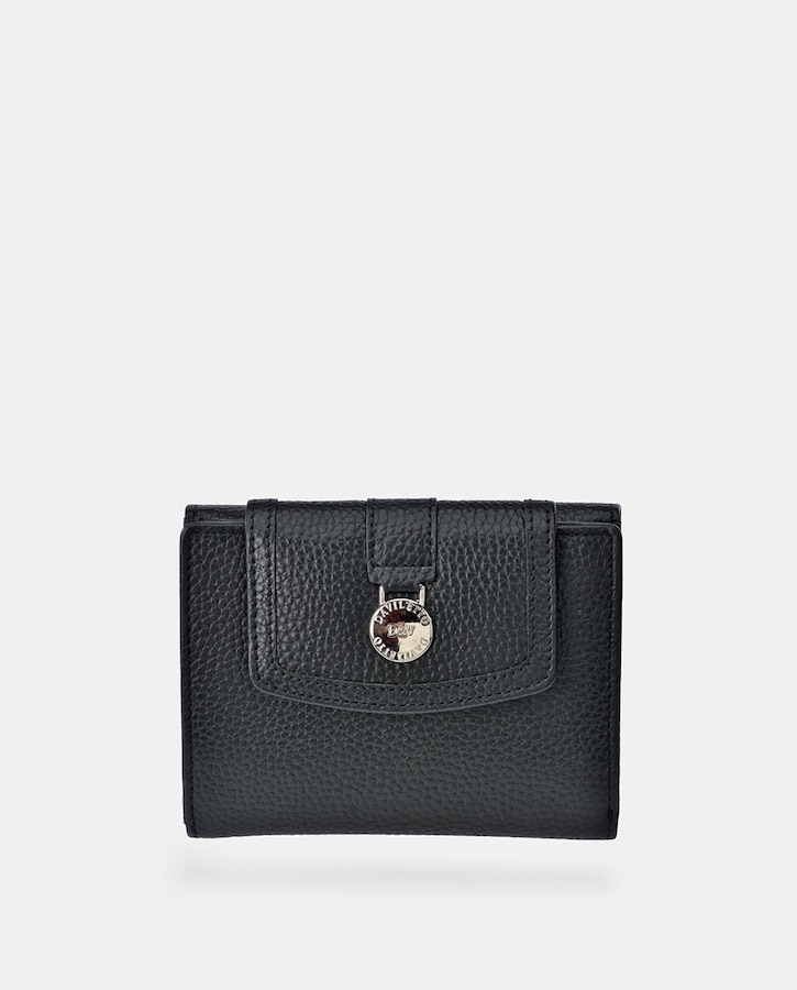 Carteira Pequena com Aba, Fecho Metálico e em Pele - Preto