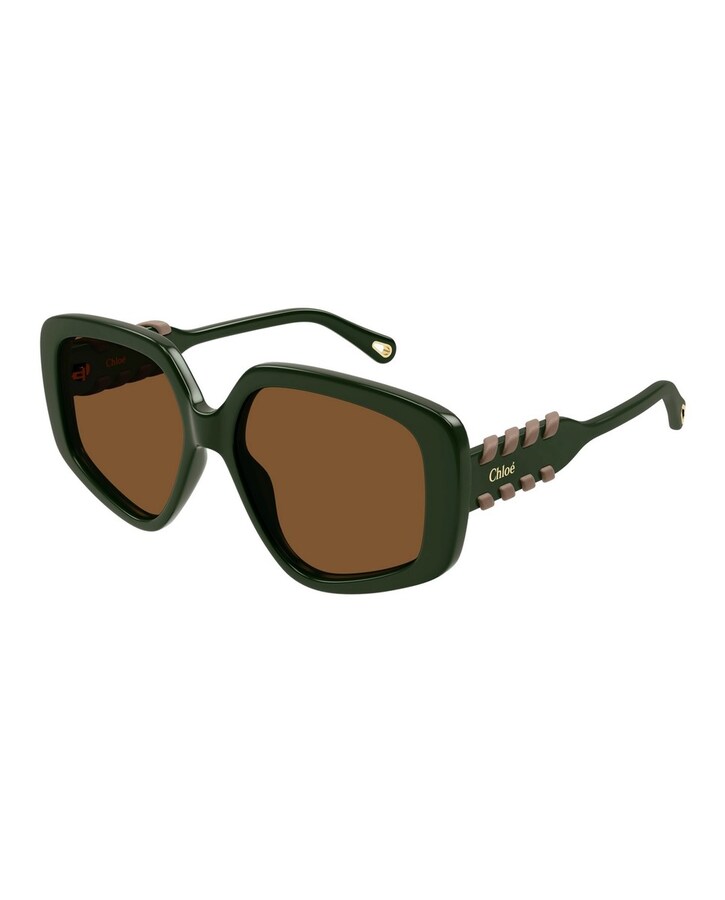 Óculos de sol extragrande com formato geométrico. Haste com detalhe ergonômico em couro. Acetato renovado com construção grossa em cores lisas com lentes contrastantes.