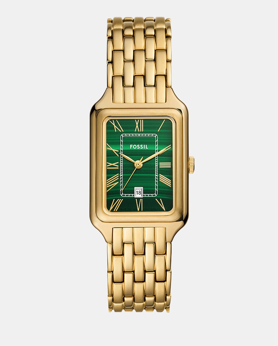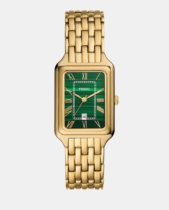 Este relógio retangular da Fossil tem um mostrador em malaquite genuína, movimento de três ponteiros e data, com uma caixa de 26 mm e uma bracelete de 7 elos em aço inoxidável dourado escovado e polido de 14 mm.