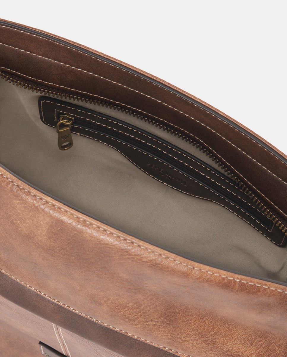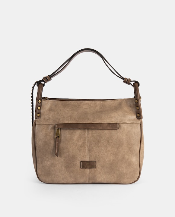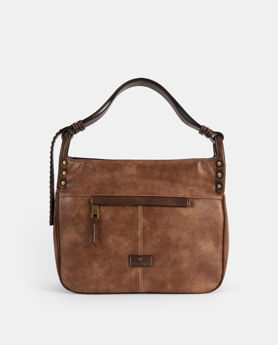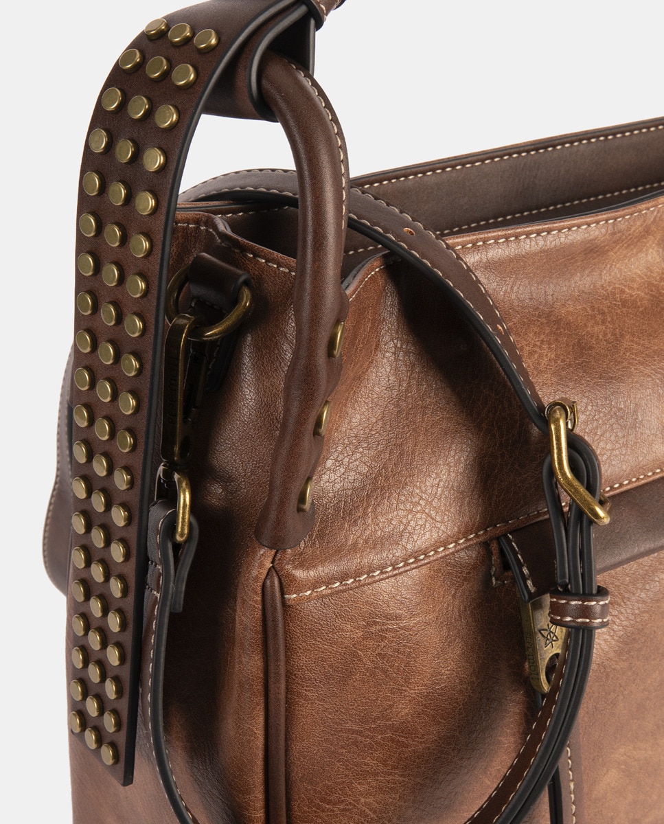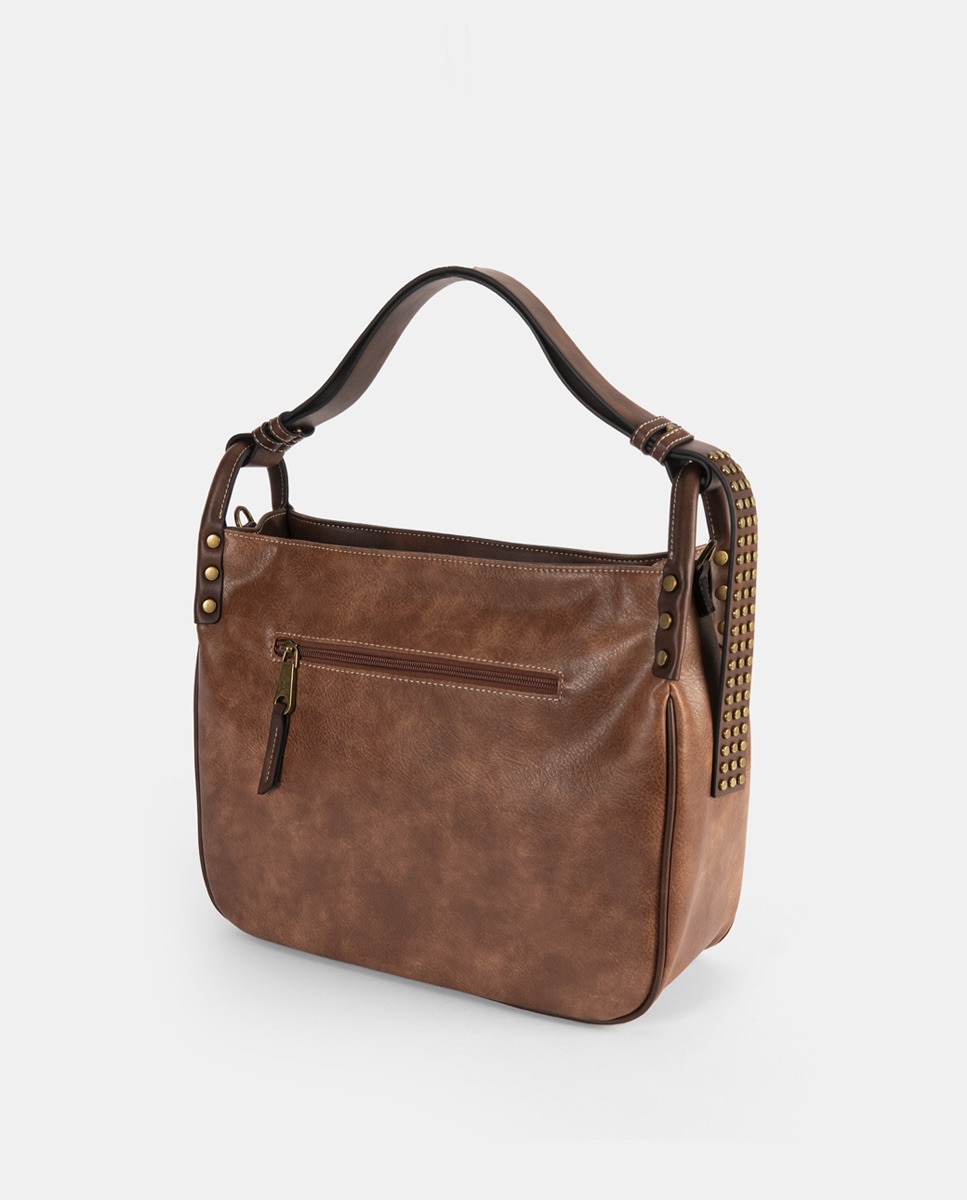 Mala de Ombro de Efeito Desgastado com Detalhe de Tachas, Fecho de Correr e Alça Comprida Ajustável