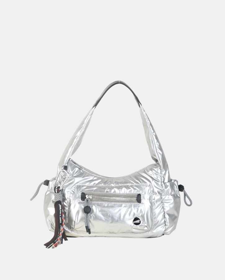 Mala de Ombro Tipo Baguette em Nylon com Detalhes Desportivos - Prateado