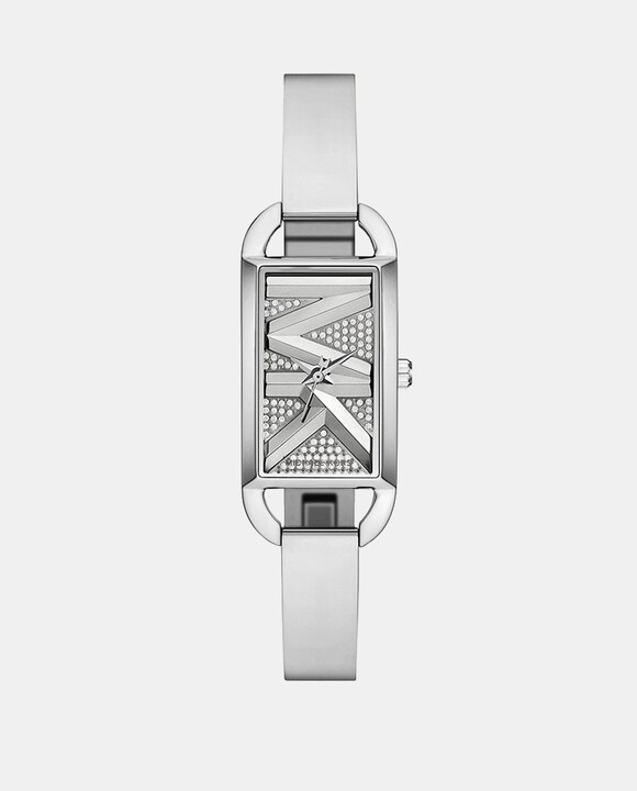 O relógio MK Empire 22 mm da Michael Kors tem um mostrador prateado com cristais, movimento de três ponteiros e bracelete em aço inoxidável coberta de cristais.