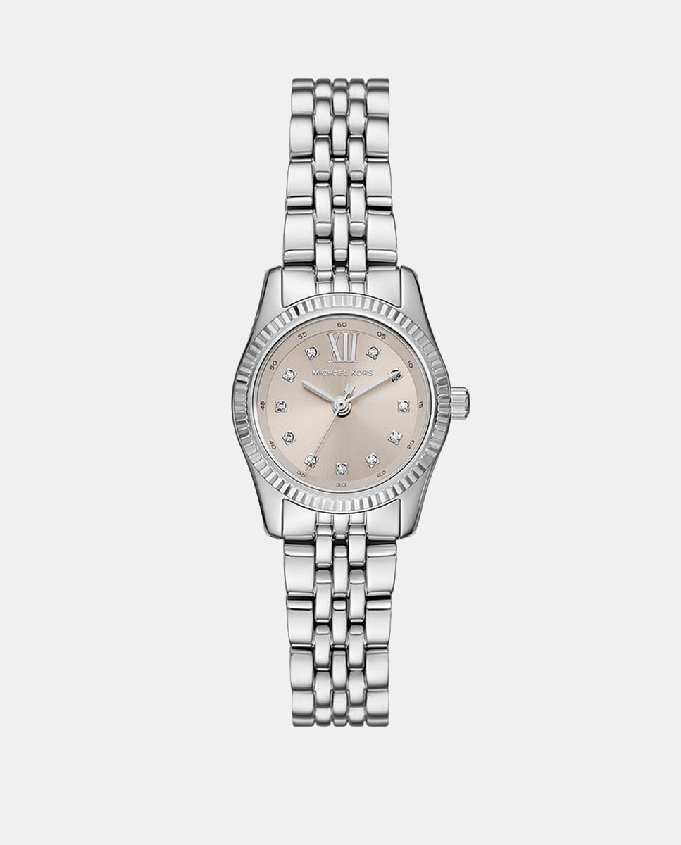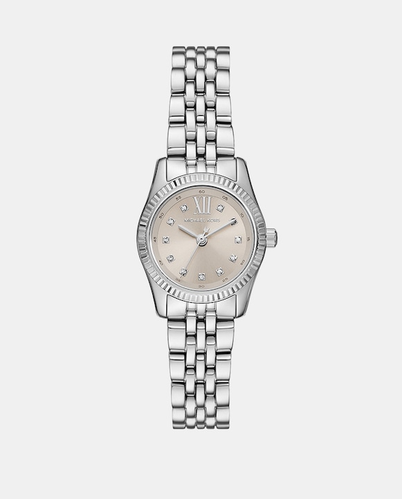 O relógio Lexington de 26 mm da Michael Kors apresenta um mostrador em tons de ostra com efeito sunray, movimento de três ponteiros e bracelete em aço inoxidável.