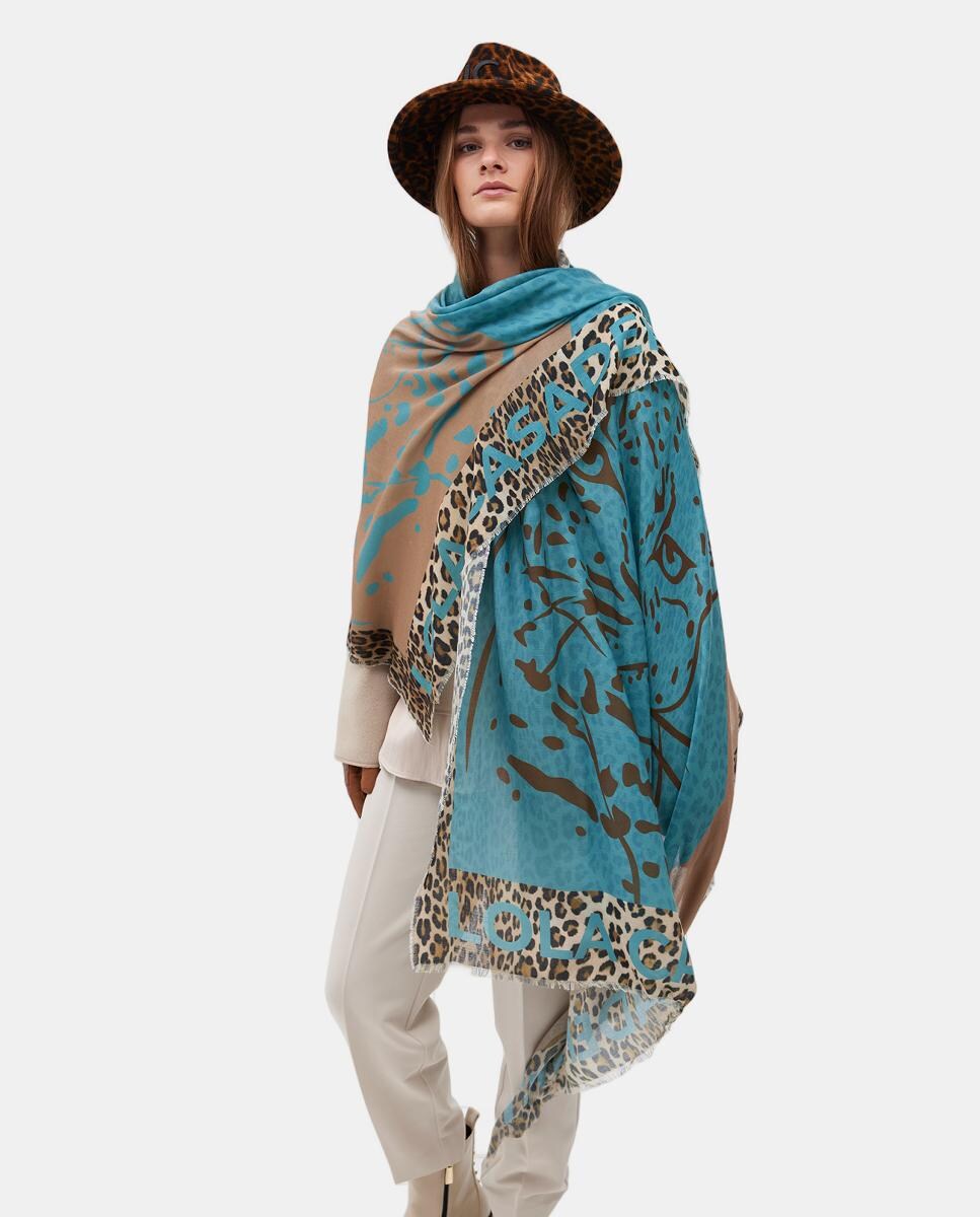 Écharpe com Estampado de Cara de Tigre Dupla Invertida - Verde/Castanho