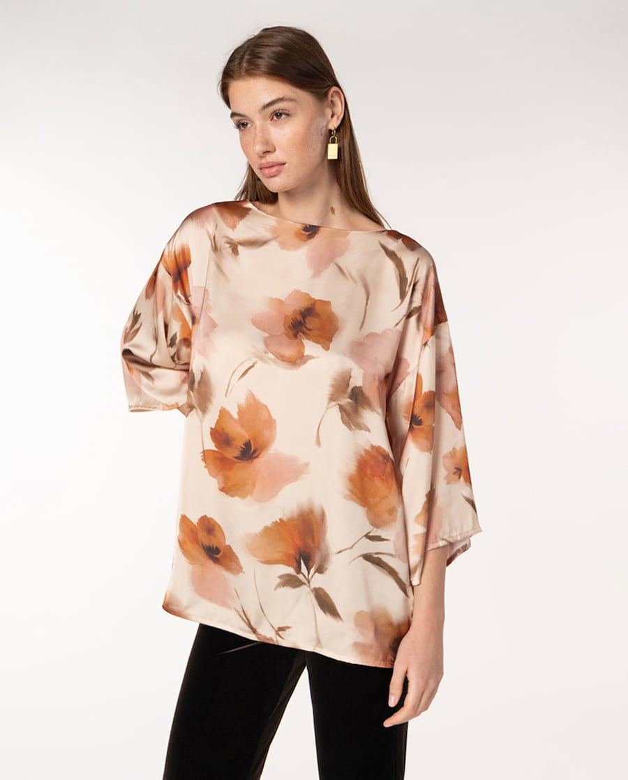Blusa de Cetim com Estampado Floral e Decote à Barco
