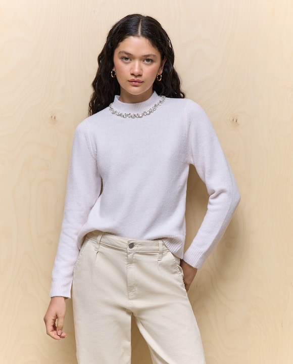 Camisola de Malha de Decote Redondo com Colar de Pedras