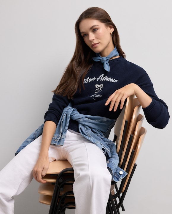 Camisola de malha com decote redondo e manga comprida.