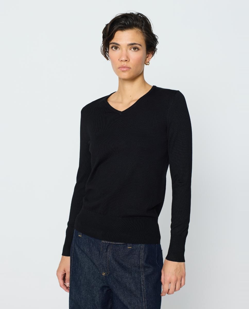 Camisola de Malha Básica com Canelado Largo, Decote em Bico e Manga Comprida