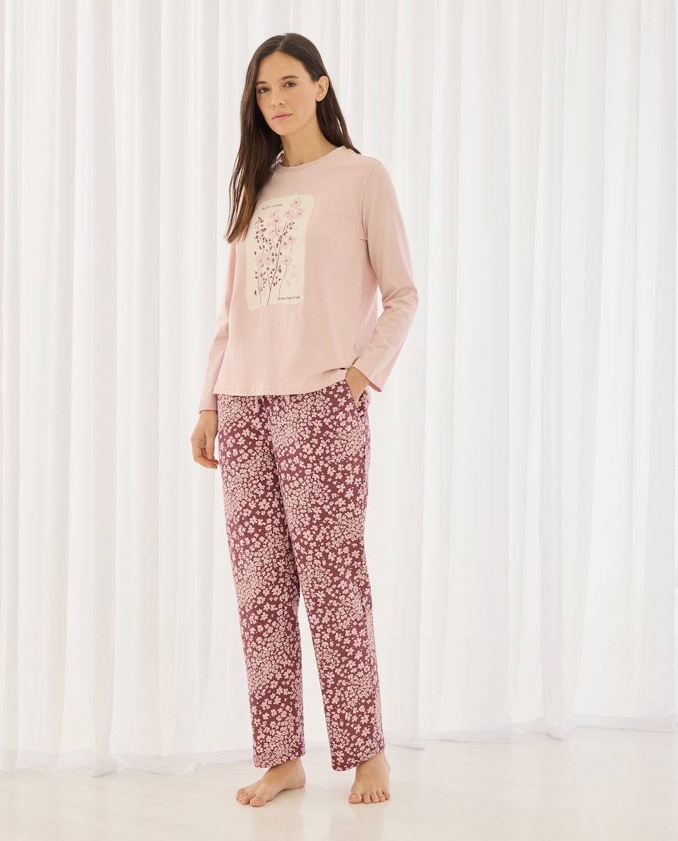 Calças de Pijama com Estampado Floral e Detalhes de Piconela
