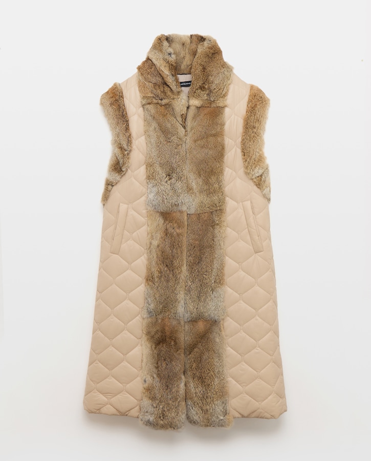 Colete Comprido de Nylon com Pelo de Coelho