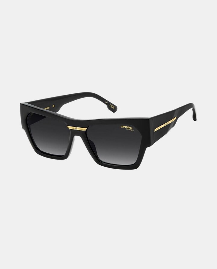 Óculos de sol fabricados em Itália com um estilo arrojado. Estas armações Carrera apresentam uma frente moderna em formato de olho de gato e novas hastes oversized para a estação. A placa metálica Victory «C» adiciona um toque icónico. Disponíveis em preto e dourado clássicos ou em cores sazonais, incluindo uma opção transparente.