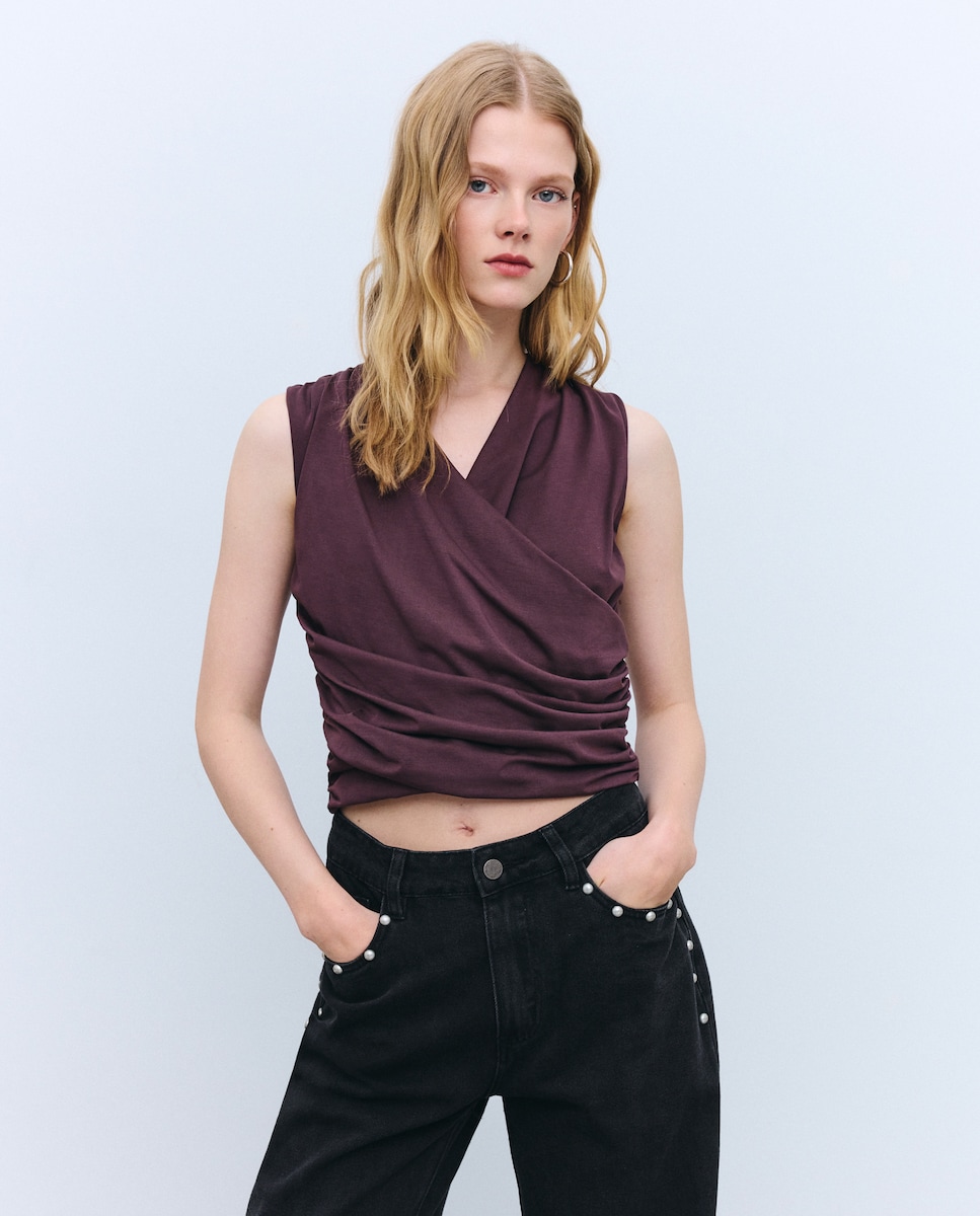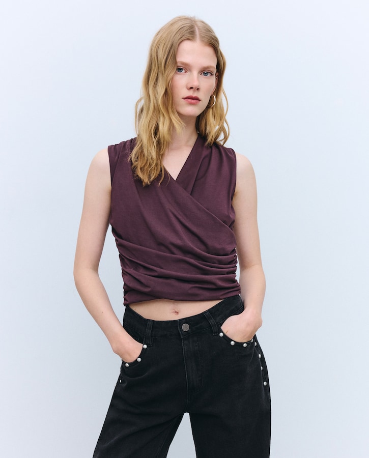 T-shirt de Manga Curta e Decote Cruzado Drapeado