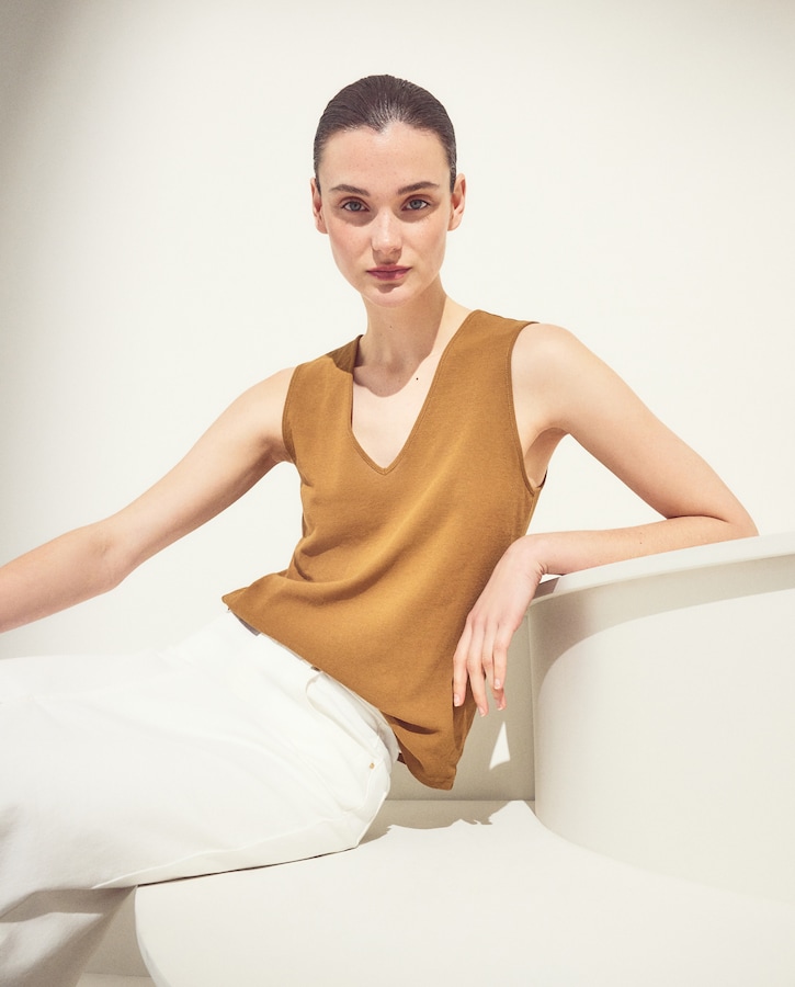 T-shirt sem mangas e com decote em bico