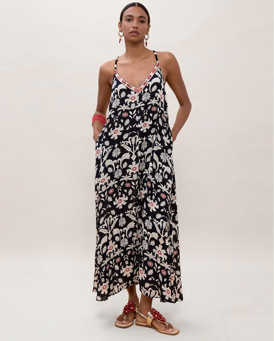 Vestido comprido com alças finas e estampado étnico vibrante. Design fluído ideal para o verão. Tecido leve que aporta frescura. Decote em V aprofundado e detalhe nas costas. Perfeito para um look boémio e moderno.