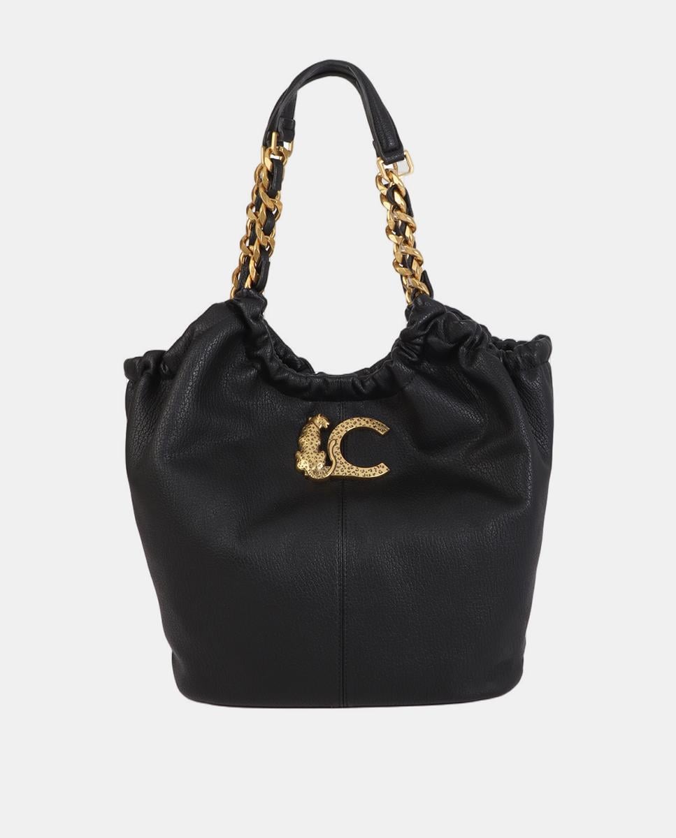 Elegante mala shopper com detalhe de corrente dourada. Decorada com emblema animal na parte frontal. Interior espaçoso com bolsos. Ideal para o uso diário. Fecho seguro para os teus pertences.