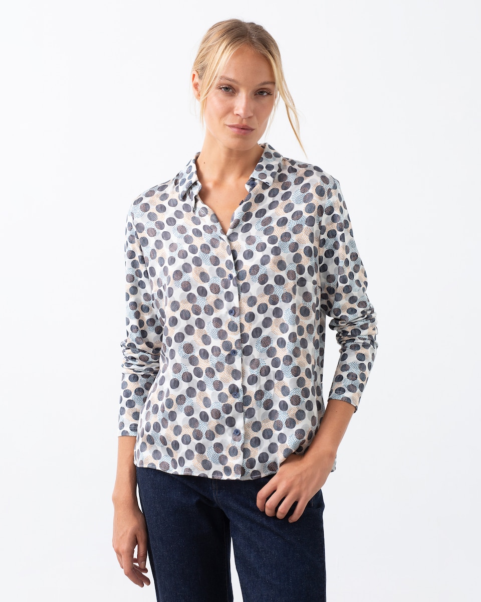 Camisa COL T-shirt de manga comprida com gola tipo camisa e fecho com botões na parte frontal. Tecido estampado na parte frontal e malha nas costas, gola e mangas do mesmo estampado de poás.