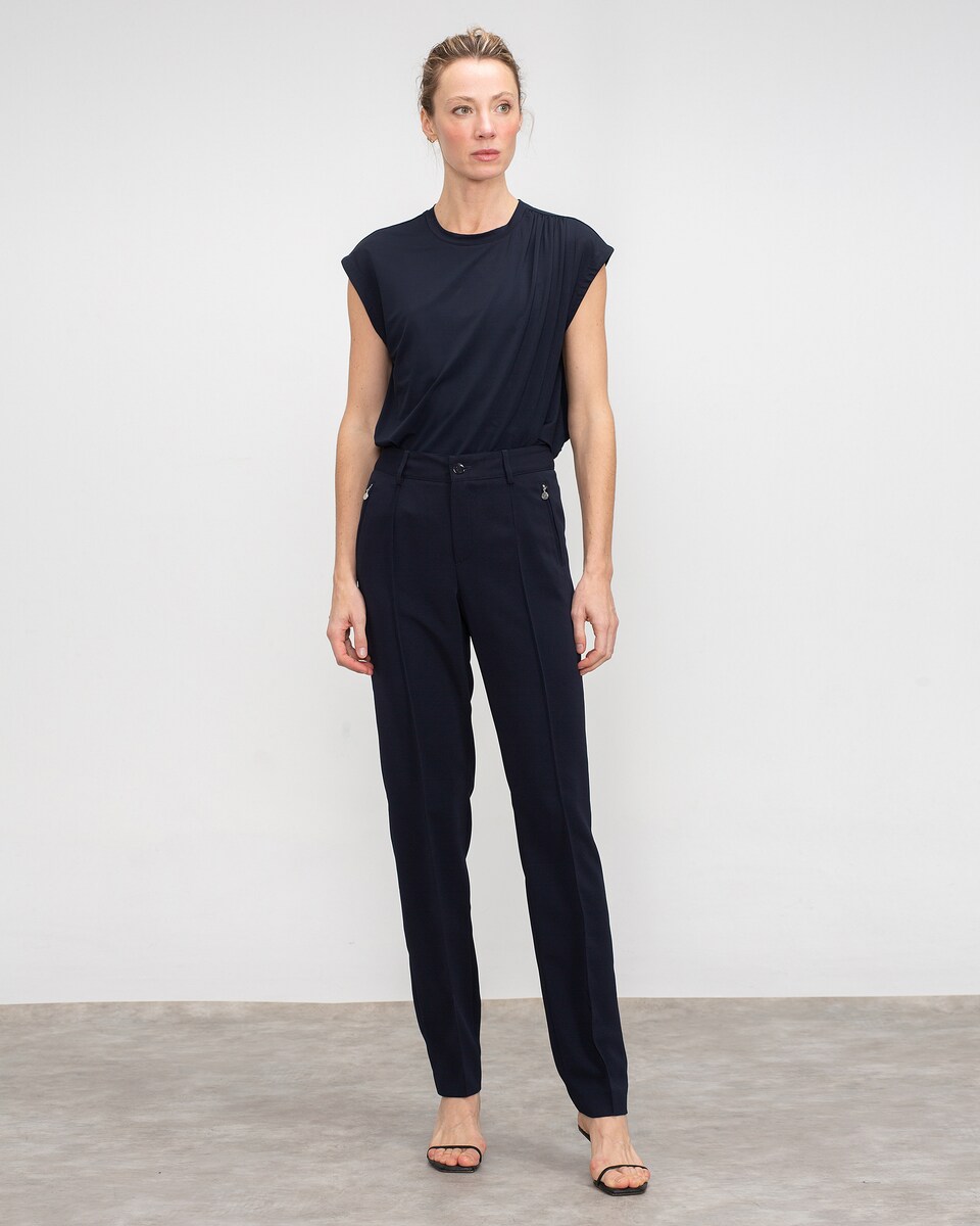 Calças PAY com corte a direito de cintura alta com nervura frontal e bolsos com fecho zip. Cós com presilhas para cinto.