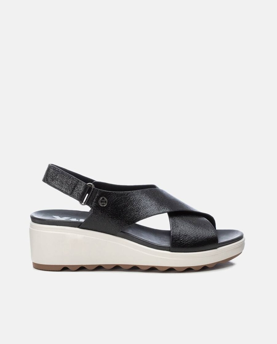 Sandálias de mulher, da marca Xti. Fabricadas em material que imita a pele, de alta qualidade com acabamento metalizado. Modelo de tira cruzada. Fecho através de tira aderente. Sola de borracha antiderrapante. Este modelo obteve o certificado vegano pela organização mundial PETA (Organização dos direitos dos animais).