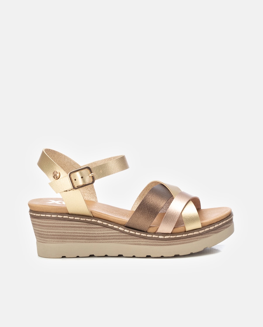 Sandálias de mulher, da marca Xti. Design de tiras cruzadas com material que imita a pele. Fecho por fivela metálica. Cunha de 6cm com sola antiderrapante. Este modelo obteve o certificado vegano pela organização mundial PETA (Organização dos direitos dos animais).