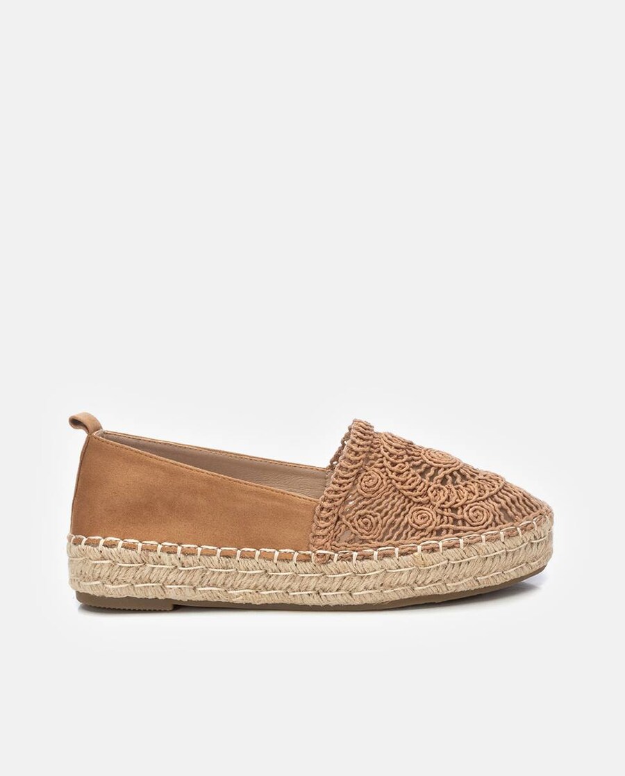 Alpercatas de mulher, da marca Xti. Fabricadas em material têxtil combinadas com bonito design de crochet ao tom. Sola plana de juta e antiderrapante. Este modelo obteve o certificado vegano pela organização mundial PETA (Organização dos direitos dos animais).