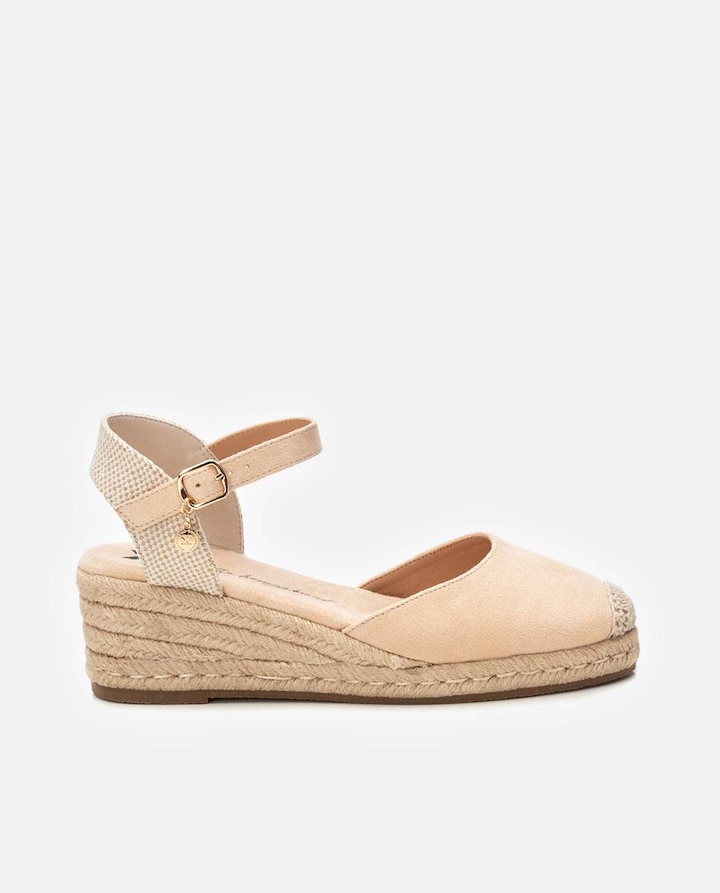 Alpercatas estilo valenciana de mulher, da marca Xti. Fabricadas em camurcina e material têxtil no calcanhar. Fixação com fivela. Cunha baixa de juta com sola antiderrapante. Este modelo obteve o certificado vegano pela organização mundial PETA (Organização dos direitos dos animais).