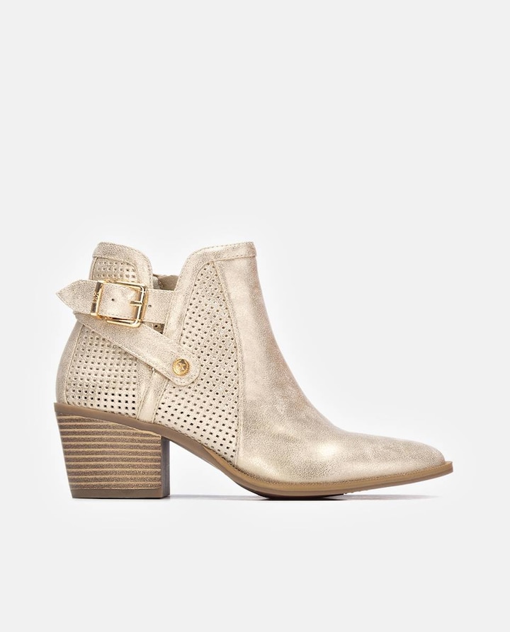 Botins de mulher, da marca Xti. Fabricados em suave camurcina, este modelo destaca pelo seu design de inspiração western, com um bonito perfurado na lateral e uma fivela decorativa que adiciona carácter ao conjunto. Sua biqueira ligeiramente afiada estiliza a silhueta, enquanto que o tacão efeito madeira estilo cowboy aporta personalidade sem renunciar ao conforto. Ideal para looks de entre-tempos com um toque boémio e atual, é um botim versátil que combina na perfeição com peças fluidas ou jeans ajustados. Com fecho de correr interior para facilitar o seu calçar. Este modelo obteve o certificado vegano pela organização mundial PETA (Organização dos direitos dos animais).