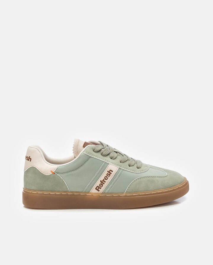 Sapatilhas de mulher, da marca Refresh. Fabricadas combinando nylon de alta qualidade e material que imita a pele. Fecho com atacadores reguláveis. Com palmilha extraível. Com sola de borracha antiderrapante. Este modelo obteve o certificado vegano pela organização mundial PETA (Organização dos direitos dos animais).