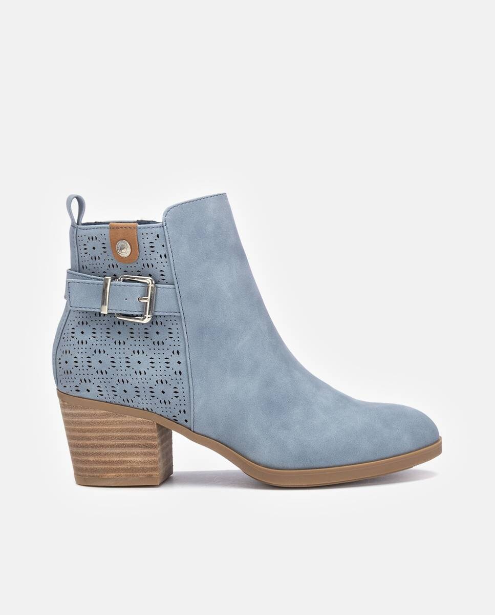 Botins de mulher, da marca Refresh. Fabricados em material que imita a pele. Parte posterior perfurada. Correia com fivela decorativa. Alça posterior. Fecho de correr interior. Detalhe de correia com fivela decorativa. Tacão largo de 5 cm. Sola antiderrapante.