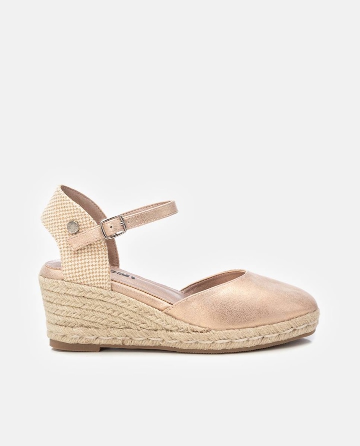 Alpercatas tipo valenciana de mulher, da marca Refresh. Fabricadas em material que imita a pele com efeito metalizado. Fivela no tornozelo. Cunha de 5cm de juta e sola de borracha antiderrapante. Este modelo obteve o certificado vegano pela organização mundial PETA (Organização dos direitos dos animais).