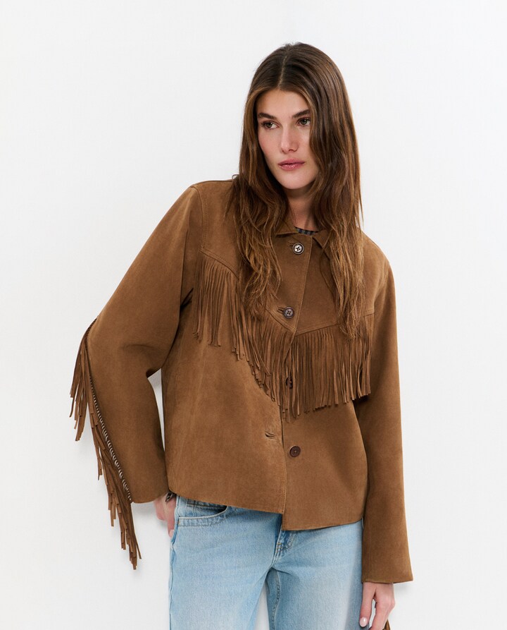 Blusão de pele com franjas, gola com lapelas e fecho mediante botões.