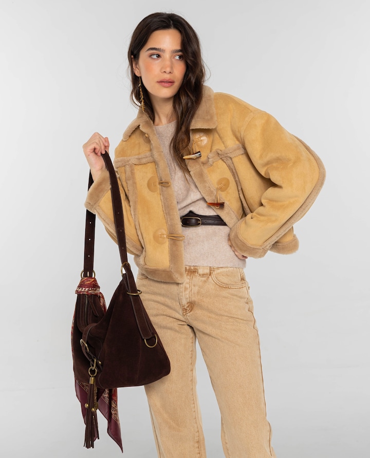 Casaco curto efeito pele reversível em camelo com interior efeito ovelha visível na gola e costuras. Fecho frontal com molas de chifre. Design com corte a direito com gola.