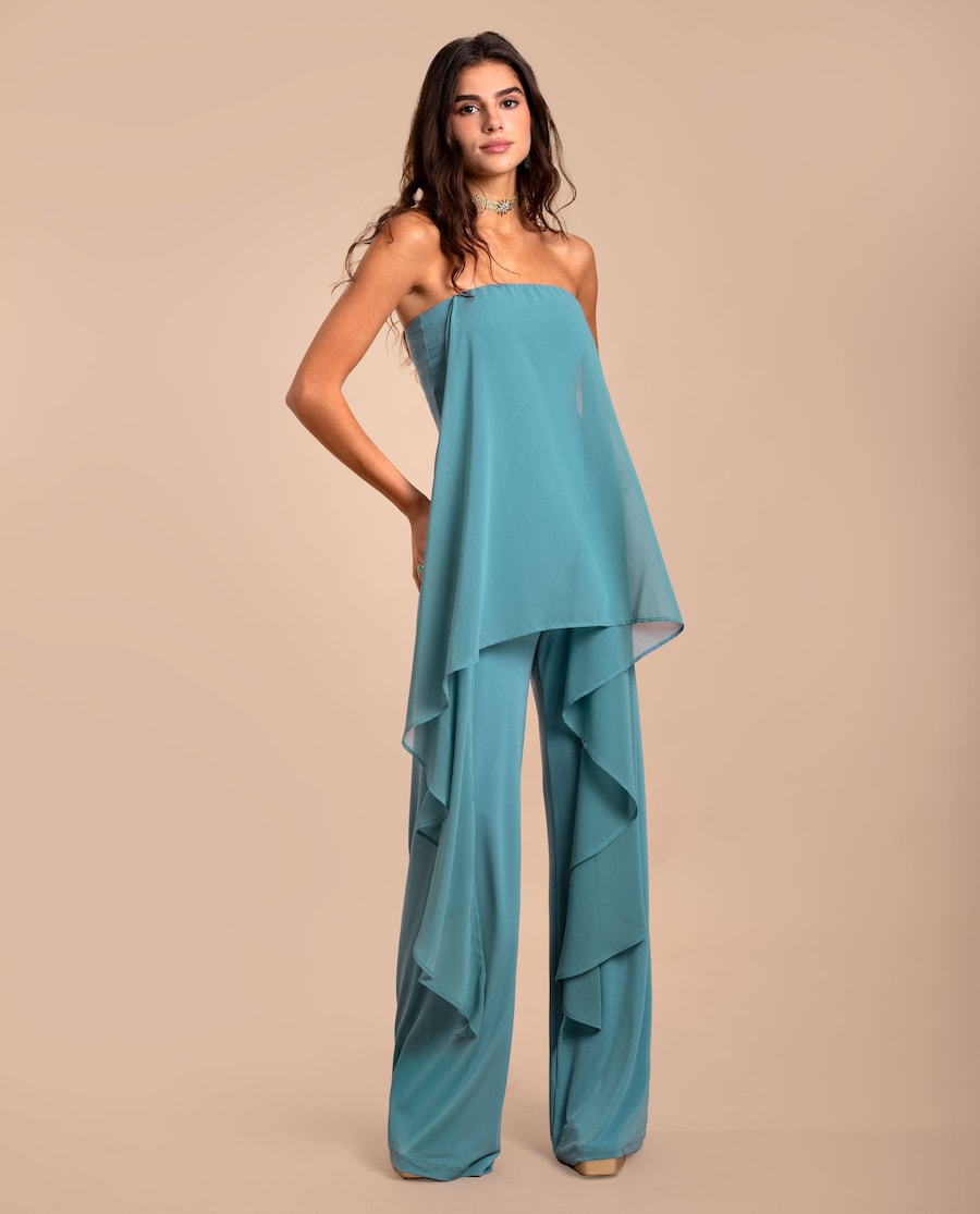 Macacão palavra de honra com capa multiposições. O corpo é ajustado, de malha elástica para que se adapta perfeitamente à tua silhueta e com o calças palazzo para o tornar ainda mais elegante. Tem os ombros à mostra, mas graças à sua capa de chiffon o poderás usar com decote bardot, assimétrico ou totalmente coberto conforme a ocasião.