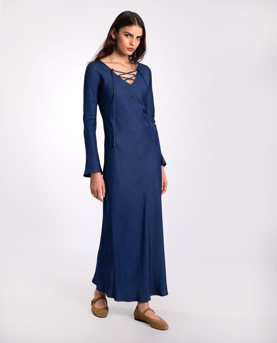 Vestido midi com decote em V. Confecionado em um tecido elástico, leve e muito confortável. Detalhe de decote em V com cordões ajustáveis e mangas flared. Sem forrar.