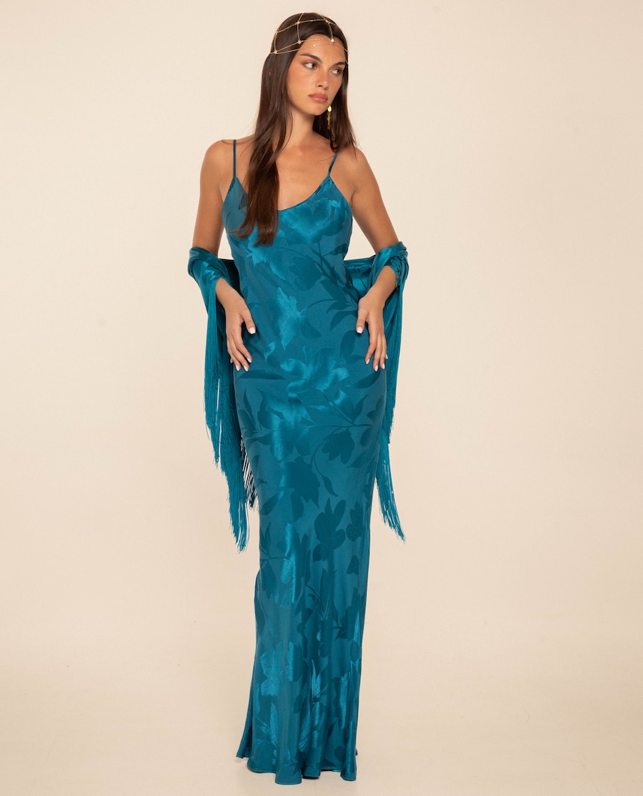 Vestido comprido tipo lingerie de alças finas e decote em V. Confecionado em tecido jacquard e cortado ao bies para que se adapte às tuas curvas.