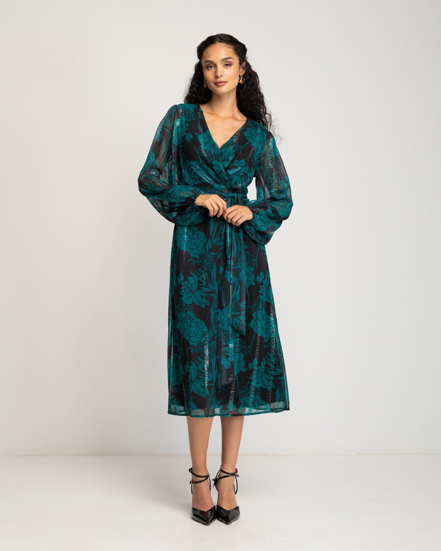 Este vestido com comprimento midi destaca pelo seu estampado floral em verde-esmeralda sobre fundo escuro, uma combinação que transmite força e sofisticação. O seu tecido leve e ligeiramente transparente aporta movimento, enquanto o decote cruzado e o cinto na mesma tonalidade definem a silhueta com suavidade. Com mangas compridas voluminosas e saia de caimento fluido, é uma peça ideal para ocasiões especiais ou para potenciar o seu estilo quotidiano com um toque refinado e atual.