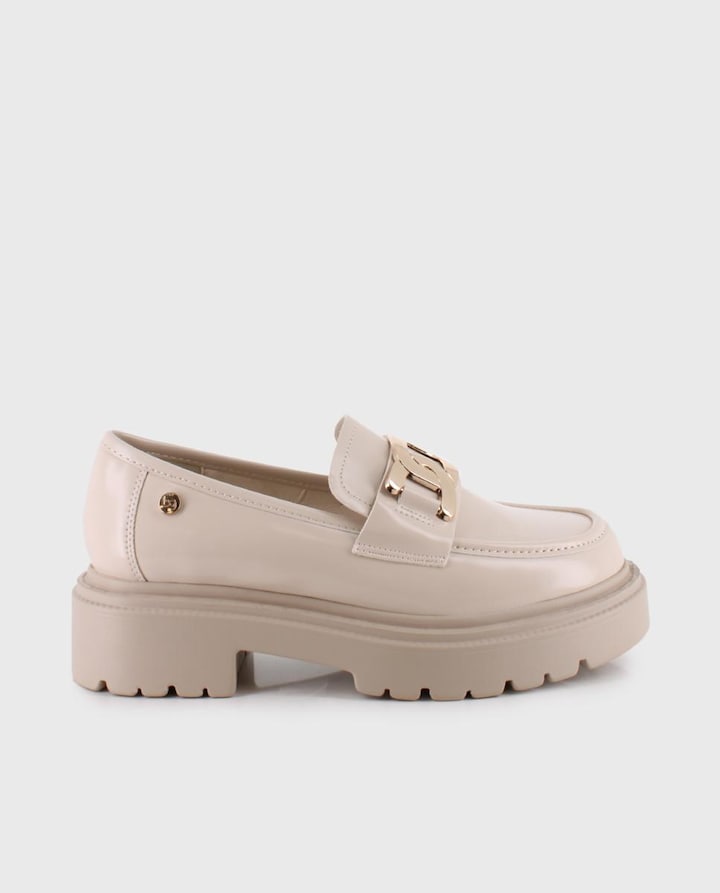Mocassins em pele sintética com decoração de partes de ferro na parte superior e salto largo.