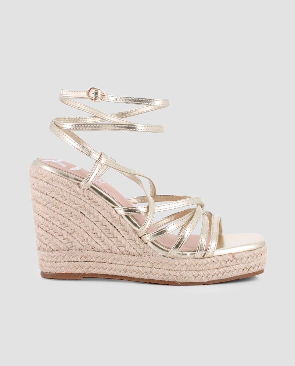 Sandálias de cunha com tiras entrelaçadas no peito do pé. Fivela no tornozelo com fecho de fivela.