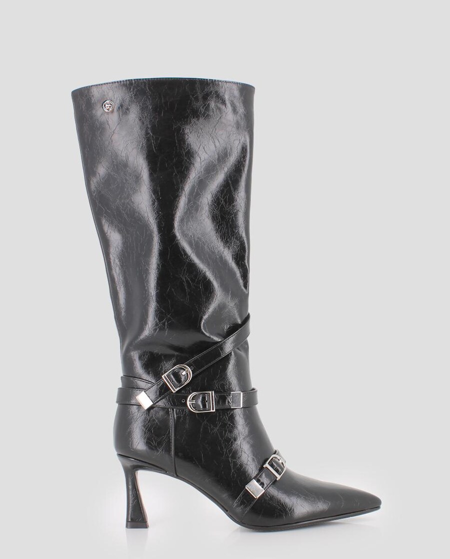 Botas de cano alto em pele sintética texturizada com tacão fino e fivela decorativa.