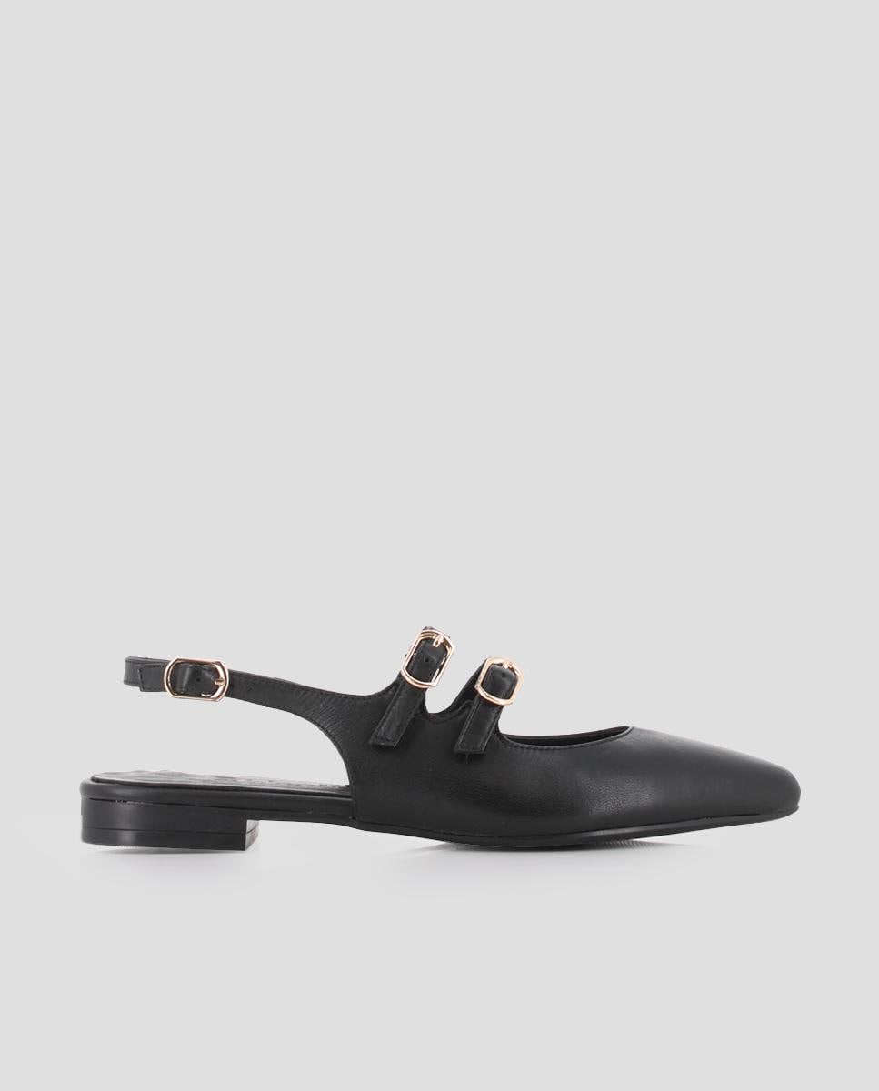 Sabrinas para mulher em pele com design aberto atrás, terminado em biqueira afiada e tiras com fivelas na parte superior.