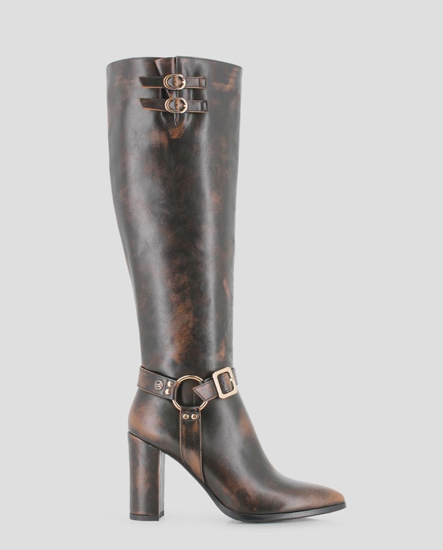 Botas de cano alto para mulher em pele sintética com detalhes metálicos na parte superior com tacão alto.