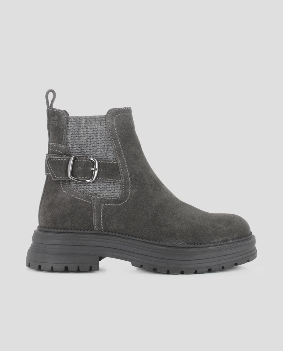 Botins de plataforma para mulher em pele com detalhe de fivela e elástico na lateral.