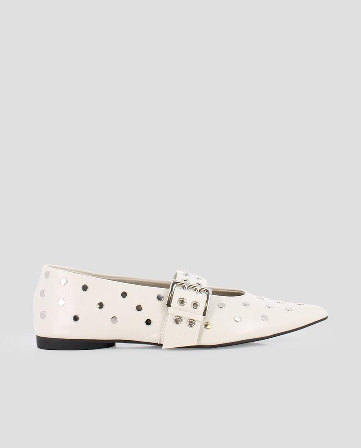 Sabrinas com acabamento em biqueira e tachas na parte superior.