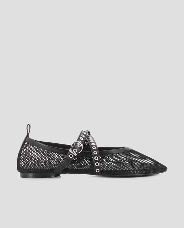 Sabrinas para mulher com parte superior em material sintético tipo rede com tiras na parte superior com ilhós metálicos e fivelas.