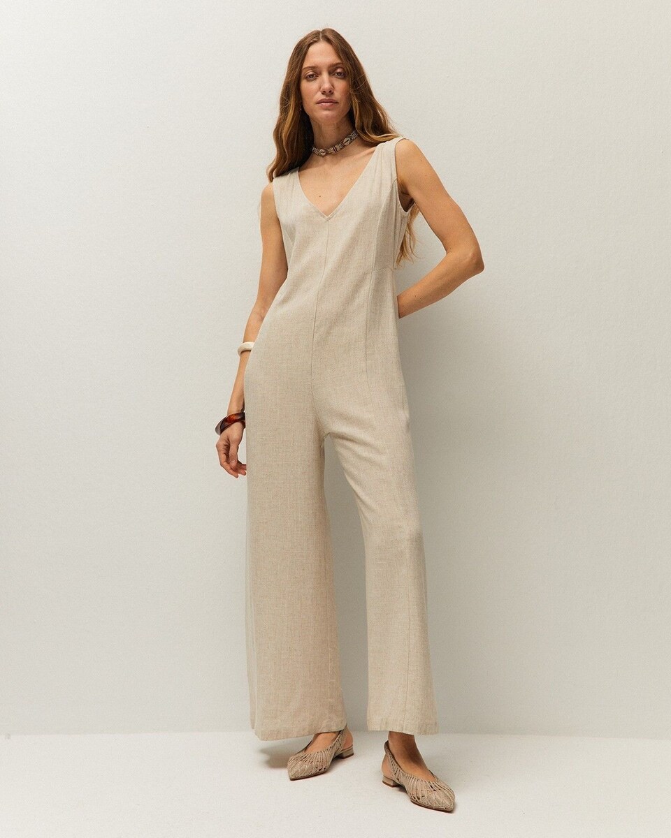 Macacão ajustado comprido de mulher com gola em V e alças. Detalhe de costuras laterais na parte frontal. Peça sustentável.