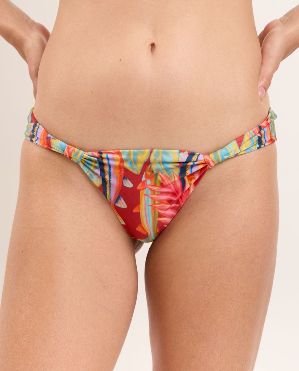 Cueca de biquíni corte brasileiro em tecido estampado fantasia.