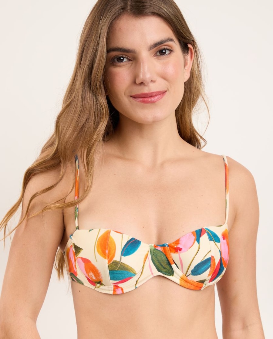 Top de biquíni com forma de balconette em tecido estampado fantasia com enchimento.