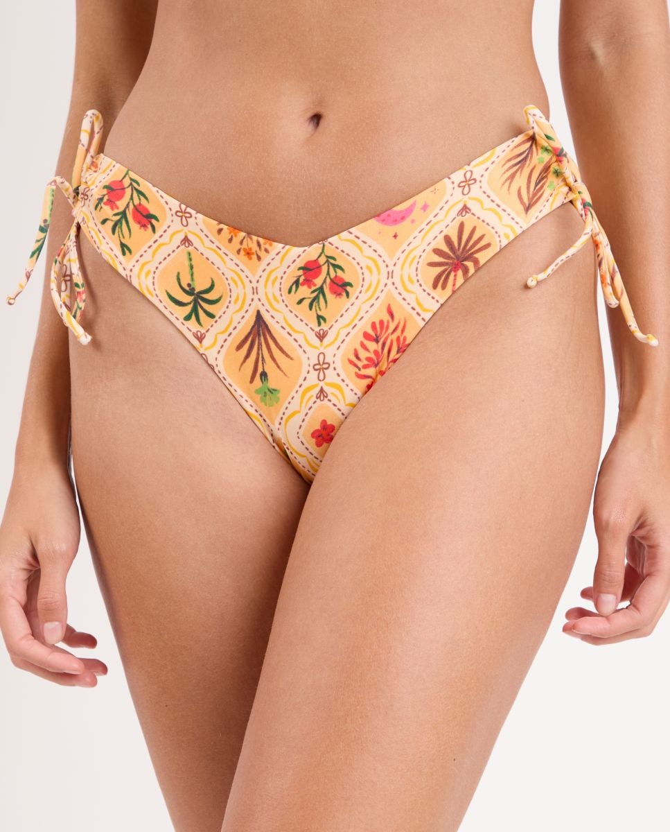 Cueca de biquíni com corte e laço em tecido estampado fantasia.