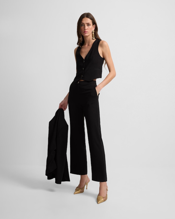 Calças clássicas de vestir de corte Relaxed fit. Apresenta fecho com botão personalizado e fecho de correr, presilhas na cintura e bolsos laterais e posteriores. Fabricadas em Espanha.