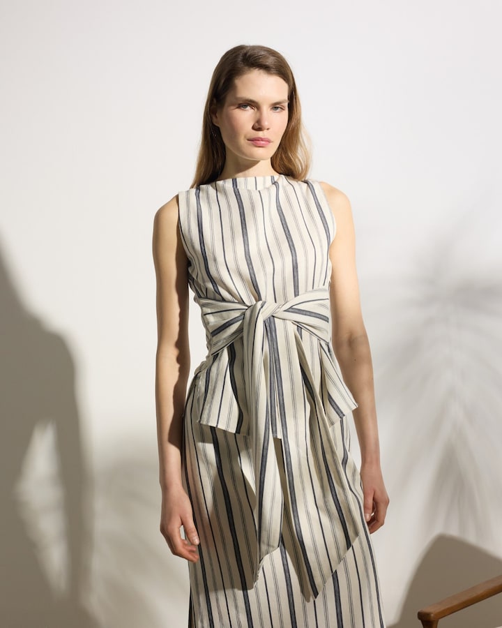 Top Unique de alças confecionado em mescla de linho e algodão. Apresenta estampado às riscas em azul e bege. Conta com bolsos vivos, botões personalizados Silbon no centro. Fabricado em Espanha. Disponível saia a condizer.