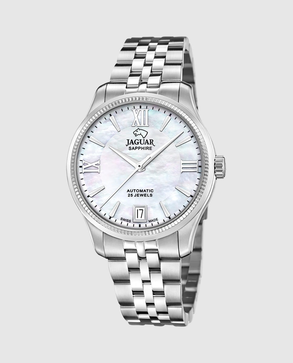 Relógio suíço de mulher Jaguar, da Coleção Héritage. O modelo J1000/1, de cor Branco pérola, branco pérola e índices de cor Prateado, oferece uma visualização perfeita graças ao seu cristal de Safira. A escolha de um cristal de safira garante uma excepcional visibilidade do relógio e lhe confere uma enorme resistência a riscos. Por suas características, o cristal de safira é excepcionalmente duro. Apenas o diamante oferece maior dureza que este material e é o material de escolha para peças que resistam ao passar do tempo mantendo sua beleza e boa presença. Além disso, o cristal que equipa este relógio inclui um tratamento antirreflexo, evitando em grande medida o aparecimento de incómodos reflexos que dificultam a correta visualização do mostrador em determinadas condições de iluminação. Este relógio analógico está realizado em aço inoxidável. O aço inoxidável, também denominado aço cirúrgico, é uma liga de características especiais de grande resistência à corrosão e a riscos. Além disso, este material é hipoalergénico de grau cirúrgico, com o que se evitam possíveis reações da pele pelo seu uso continuado. O Jaguar J1000/1 é um relógio Automático com um movimento P024 AUTOMATICO fabricado na Suíça, um mecanismo de qualidade e precisão comprovadas durante anos, e indica com uma grande fiabilidade as horas, minutos e segundos. Vem equipado com uma bracelete de aço inoxidável de cor Aço e com um fecho oculto, que dá a sensação de uma bracelete contínua, sem fecho, ao redor do seu pulso. Desde sua fundação em 1938, os relógios da marca Jaguar se mantiveram fiéis aos valores que impulsionaram seu fundador a aventura de lançar uma nova marca de relógios: perseguir a mais absoluta beleza e força em cada uma das peças que são manufacturadas. Para conseguir isso, na Jaguar somos fiéis à tradição relojoeira de alta precisão suíça, dotando-a das tecnologias mais avançadas para garantir aos proprietários de um relógio Jaguar a maior fiabilidade e precisão.